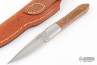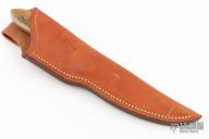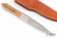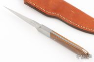 This Boot Knife by Ron Gaston features a spear point blade with false top edge, hand rubbed satin finish, .150" blade stock and .823" blade depth, full tapered tang construction. The handle is comprised of dovetailed stainless steel bolsters, and pinned mammoth ivory scales. Comes with a brown leather belt sheath. Has a couple light scratches, otherwise Excellent Condition.