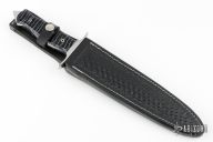 This Dagger by Walter Brend features a mirror polished double-edged blade, .275" blade stock and 1.358" blade depth, full tang construction. The handle has a mirror polished stainless steel guard with mammoth tooth scales, black liners and mosaic pins. Comes with a hand tooled black leather sheath and a zippered case. Excellent condition.