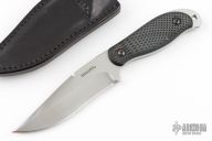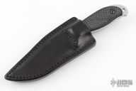 This fixed blade by Sal Manaro features a hand rub satin finished blade with false top edge and notched thumbrest, full tang construction with .202" blade thickness and 1.233" blade depth. The handle has milled black G-10 scales. Includes a black leather sheath with belt clip. Nice feel in hand. Excellent condition.