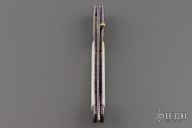 This linerlock by Chuck Gedraitis features a Damascus blade with a gold thumbstud that has a blue stone inset. The handle has Damascus bolsters, mother of pearl scales, anodized and fileworked titanium liners, fileworked stainless steel backspacer with mother of pearl inlays. Nice detent, lockup and blade seating. Excellent condition.