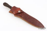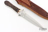 This gorgeous dagger by Herman Schneider has a mirror polished blade with .190 blade stock and 1.159" blade depth and a hidden tang construction. Stag handle is very comfortable with nice deep recesses and satin stainless guard. Nearly perfect grinds from a very respected knife maker. Nickel silver frame tang. Comes with a leahter sheath and zipper case. Has some light scuffs and scratches, excellent condition otherwise.