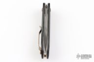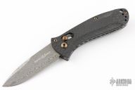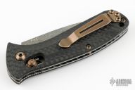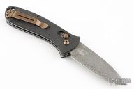 This Benchmade 5500-81 Mini-Presidio Auto Axis #45 of 50 features an acid-etched hakkapella damasteel stainless damascus drop point blade, auto-axis ambidextrous mechanism, hand finished carbon fiber scales over jeweled liners. Hand polished and heat colored bronzed hardware, clip, barrel spacers, and thumbstuds. Includes original packaging and paperwork dated Sept 5, 2008. Excellent Condition.