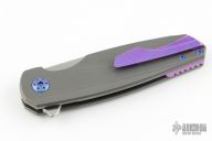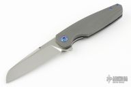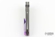 This Haptic by Holt Bladeworks features a tumbled blade with a notched thumbrest and flipper tab. The handle features a milled and anodized titanium frame with a timascus tip up pocket clip with hidden hardware and backspacer. Nice detent, lock up and blade seating. Includes the original box and card. Excellent Condition.  The blade spine says "MAG" but the COA says M390. Serial numbers on the card and inside the frame match.