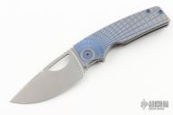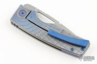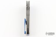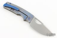 This knife by the OZ Machine Company features a tumbled Magnacut blade with thumbhole and notched thumbrest. The handle features a milled, anodized and tumbled titanium frame with an anodized titanium backspacer and tip up clip with hidden screws. Includes box, extra screws and papers dated 10-24-23 and s/n 2461.  Excellent Condition.