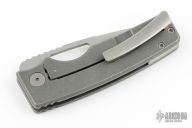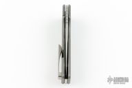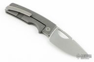 This knife by the OZ Machine Company features a tumbled blade with thumbhole and notched thumbrest. The handle features a smooth blast and tumble finish titanium frame with a tumbled titanium backspacer and tip up clip with hidden screws. Includes box and papers dated 12-11-23 and s/n 2684. Excellent condition.