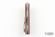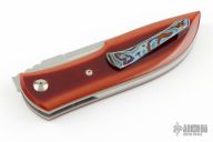 This Front Flipper by Remi Lavialle features a hand rub satin finished blade with swedge and notched thumbrest, front flipper style opening. The handle has vintage butterscoth paper micarta scales, bead blasted titanium liners, and a stainless steel backspacer. Tip up MokuTi pocket clip. Rides on bearings, nice detent, lockup and blade seating. Excellent condition. Comes with a leather slip sheath.