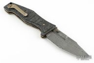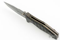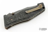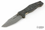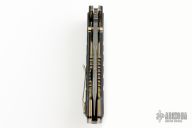 The 757-151 Vicar is a phenomenal Gold Class knife from Benchmade. It stands out with a custom twelve grind, hand beveled blade by Shane Sibert. The blade is Chad Nichols "Ladder" pattern Damascus steel and fitted with titanium thumb lugs. Milled, hand finished marbled carbon fiber scales are fastened with heat colored hardware atop hand polished, anodized titanium liners. The Vicar is a modern masterpiece from designer Shane Sibert, and this Gold Class 757-151 model is collection-grade through and through. Includes the original box and papers. S/N 48 of 100. Excellent Condition.