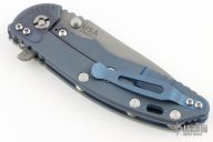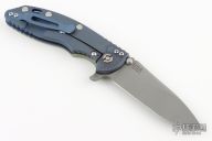 This 3.5" Slicer XM-18 flipper from Hinderer Knives has a working finished blade with notched thumbrest and flipper, no choil. Translucent green G-10 scale and a battle blue titanium frame and clip. Reversible pocket clip. Strong lock up, nice detent and blade seating is center. Includes original box, extra bushings and papers. Comes with additional blue anodized hardware kits. Excellent condition.