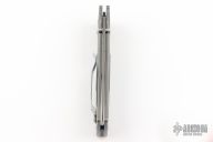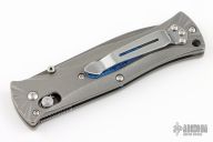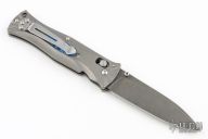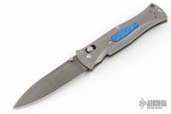 This Model 531-132 from Benchmade features a tumble finished spear point blade with swedge and dual thumb studs. The handle is comprised of a tumbled titanium frame with blue twill inlays, stainless steel reversible tip up clip. Lanyard hole in pommel. Includes original box, papers and drawstring pouch. #75 of 150. Excellent Condition.