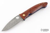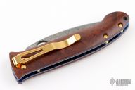 This Dejavoo by Benchmade features a Damasteel drop point blade with false top edge and thumbhole. The handle has desert ironwood scales, anodized titanium liners, and gold-plated hardware. Tip down pocket clip. Includes the original box and COA, Dated 3/24/08. Excellent condition.