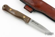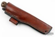 This Bushcraft USA from Adventure Sworn features a hand rub satin finished scandi ground blade with .153” blade stock and .992” blade depth, full tang construction. The handle has green canvas micarta scales with black liners and brass pins. Comes with a brown leather sheath. Has some light scratches, otherwise excellent condition.