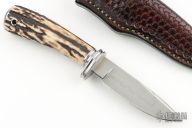 This Knife by Journeyman Smith Craig Camerer was made for Prometheus Design Werx, it features a hand rub satin finished blade with a nice hamon, .178" blade stock and .959" blade depth, hidden tang construction. The handle has a fluted stainless steel guard and collar, stag grip with a stainless steel butt. It comes with a hand tooled brown leather sheath. Excellent condition.