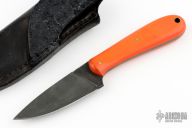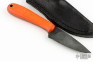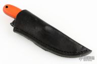 This knife by TM Hunt features a black drop point blade with a notched thumbrest, .116" Blade Stock. 1.085" Blade depth. The handle has orange G-10 scales. Includes a black leather sheath. Excellent Condition.