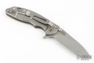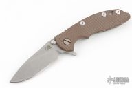 This XM-18 by Rick Hinderer features a stonewash finished slicer blade with notched thumbrest and flipper. The handle has a stonewash finished titanium frame, brown G-10 scale, satin titanium barrel spacers, and a tip up or down reversible titanium clip and filler tab, lanyard hole at the butt. Has a few scratches, has been resharpened otherwise good condition.