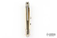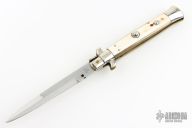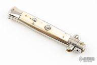 This Picklock Auto by Ethan 1953  features a mirror finish spear point blade. The handle consists of nickel silver bolsters, honey horn scales, brass D-stamp liners and stainless steel backspacer. Steel push button. The knife is marked "Ethan 1953 Italy".  Has a few light scratches, otherwise excellent condition.