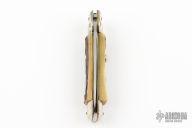 This swivel bolster auto by C Jul Herbertz features a mirror polished blade. The handle has nickel silver bolsters, front and rear, stag scales and brass liners. Strong opening. Has safety. Has a few light scratches, otherwise excellent condition.