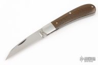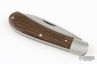 This slipjoint by Jerry Halfrich features a hand-rubbed satin finish blade with nail nick. The handle has stainless steel bolsters with integral liners, green canvas micarta covers, stainless spring. Half-stop on blade, flush in all position. Comes with a zippered case. Has some light scratches on the bolsters, otherwise excellent condition. 5 on blade.