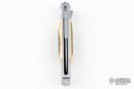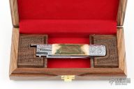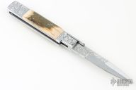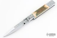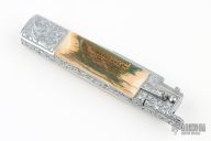 This Picklock Auto by Agasi Hambartsumian of Armenian Doctor Knives features a mirror polished blade with false top edge, engraving on the flats and spine. The handle has a fully engraved stainless steel frame with engraved stainless steel backspacer, mammoth ivory scales. Comes with a wooden presentation box. New from maker.