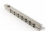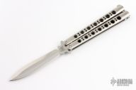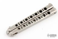This Limited Edition Balisong Model 46-01 (042/500) has a stonewashed spear point blade with false top edge. Handle is satin finished titanium with T-Latch. Excellent lockup, open and closed. Excellent condition. Comes with original nylon velcro sheath and original box and papers.
