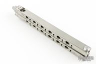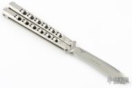 This Model 41SS Balisong from Benchmade features a recurve drop point blade with swedge. The handle has a stainless steel frame with spring T-latch. Comes with original box, papers, and belt sheath. Excellent condition.