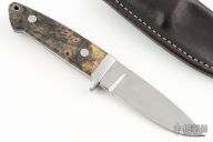 This fixed blade by Tim Steingass features a hand rub satin finished drop point blade with notched thumbrest, .185" blade stock and 1.096" blade depth, full tapered tang construction. The handle has a stainless steel guard, burl wood scales over red fiber liners. Lanyard tube in pommel. Includes leather sheath with belt loop. Has some light scratches, otherwise excellent condition.