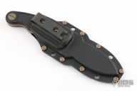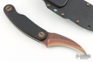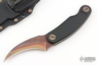 This Elvia by Turner CNC features a HT Oxide finish blade, .183" blade stock and 1.15" blade depth with full tang construction. The handle has a milled checkered black g10 scales. Comes with a kydex sheath and the knife will fit in either direction, zippered case, and COA. 60HRC with Cryo. Excellent condition.