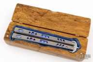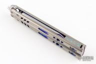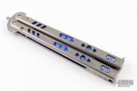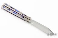 This balisong by Matt Cook features a mirror polish finished clip point blade. The handle is multi-tonal titanium with anodized spacers, and matching T-latch. Comes with a wooden box. Has a couple light scuffs and scratches, excellent condition otherwise.