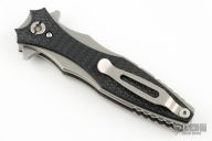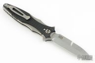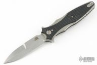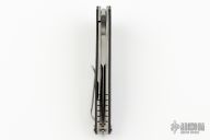 This Maximus by Hinderer Knives features a stonewashed bayonet style blade with false top edge and flipper. The handle has textured G-10 over a stonewashed titanium frame. The tumbled titanium tip up clip is reversible for right or left hand carry. Great blade seating, detent and lock up. Includes original box. Excellent condition.