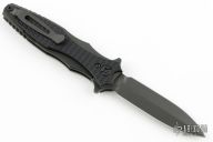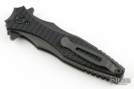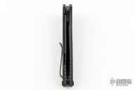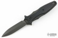 This Maximus by Hinderer Knives features a DLC black double-edged dagger style blade with flipper. The handle is comprised of textured black G-10 over DLC black titanium liners and tip up clip is reversible for right or left hand carry. Great blade seating, detent and lock up.  Comes with original box.  Excellent condition.