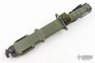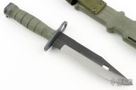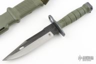 The M9 Bayonet by Ontario Knife Company was reground by Borka Blades. It has a black blade with satin grinds, sawteeth on the spine and hole in the blade that corresponds with the tab on the sheath to act as a wire cutter, .231" blade stock and 1.39" blade depth, hidden tang construction. The handle has a steel guard and butt with green nylon grip. Comes with original sheath. Has some light scuffs, but that's the way the came to Borka when he reground them. Excellent condition.