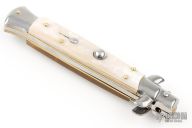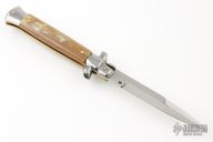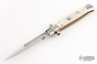 This Swivel Bolster auto by Frank Beltrame features a 4mm bayonet ground dagger blade. The handle has stainless steel bolsters and pommel with blonde horn scales over brass liners and stainless steel backspacer. Excellent condition.