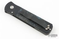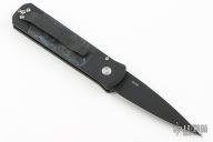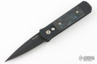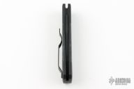 This side opening auto features a black spear point blade with a false top edge. The handle has a black aluminum frame with carbon fiber scales and a black stainless steel clip, tip up carry. Comes with original box and papers. Excellent condition.