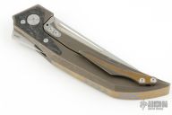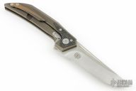 This Future model has a satin finished blade and a titanium handle with a titanium clip and carbon fiber inlays. The Future represents the first ever integral folding knife from Reate Knives. This Bharucha designed flipper offers a 1 piece titanium handle for extreme strength and reliability. The Future is a massive folder with a 4.25" M390 blade, yet it remains slim and sleek for comfortable EDC. A mokuti pocket clip and inlays finish off the collectible design. Features: Integral handle made from a solid billet of titanium provides strength and durability. Bearing pivot disassembles easily for cleaning and maintaining the knife. M390 blade offers extreme sharpness and edge retention. Comes with original box, COA and zippered case. Has some light scratches, otherwise excellent condition. #51/125
