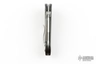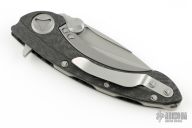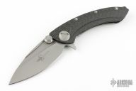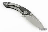 This Marfione Whaleshark framelock flipper features a two-tone double vapor blasted blade with dual thumbstuds, notched thumbrest and flipper. The handle has a sculpted 30k layer carbon fiber frame. Titanium fittings. Dagger logo on blade.  Comes with original box and zipper case. Excellent condition.