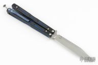 This Model 51 Morpho Balisong from Benchmade has a stonewash finished D2 stainless steel spear point blade. Handle is black G10 with blue jeweled/ anodized titanium liners and blue anodized titanium tip up clip. Comes with original box and papers. Excellent condition.