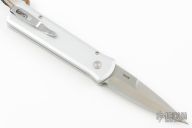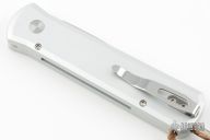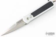 This Godson from Pro-Tech Knives features a satin finished blade with swedge. The handle has a silver aluminum frame with a GSD leather inlay, stainless steel tip up clip. Comes with original box and papers. Excellent condition.