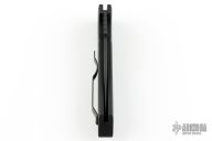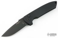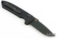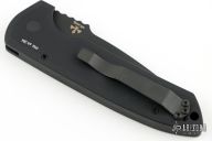 This knife features a black spear point blade with false top edge and a notched thumb-rest. The handle has a black aluminum frame with a push button and a black stainless steel clip, tip up carry. Comes with original box and papers. Excellent Condition.