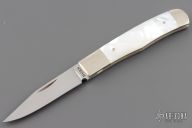 This slipjoint by Jess Horn features a hand-rubbed satin finish blade with nail nick. The handle has nickel silver bolsters and cap, nickel silver liners, mother of pearl covers and a stainless steel spring. Perfect blade seating. Opens and closes with a nice snap. #044 on blade. Comes with leather zippered case. Excellent condition.