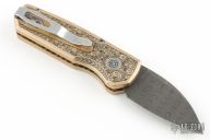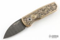 This Runt 5 by Pro-Tech features a Chad nichols Damascus blade.  The handle features a bronze aluminum frame, a stainless steel tip up pocket clip and a mosaic push button.  The handle has been hand engraved by Bruce Shaw. Comes with original box, wooden box and papers. Excellent condition.