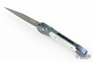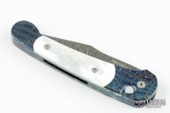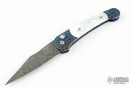 Chad Nichols high carbon Damascus frame, mirror polished and heat colored with mother-of-pearl inlays, matching pearl inlay push button, and Chad Nichols stainless Damascus blade. Includes the original box and papers. Excellent Condition.