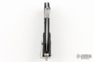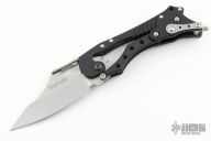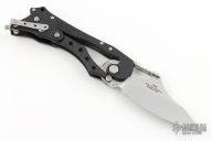 This E.T. (External Toggle) folder by Kershaw is a Grant and Gavin Hawk design, it features a bead blasted blade, black aluminum frame, and the Hawks' external toggle locking mechanism. The knife is very easy to open and close, and simply gripping the handle will keep the blade locked in the open position. There is a knurled roller safety on the spine that can be engaged to prevent partial opening of the blade during carry. Has some light scuffs and scratches, great condition otherwise.