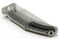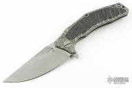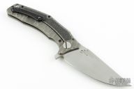 This Morrf-5 by Custom Knife Factory features an upswept hand rub satin finished blade with notched thumbrest and flipper. The handle has a stonewashed and rock textured titanium frame with carbon fiber insets and with matching tip up clip, lanyard hole and black barrel spacers. Nice detent, lockup and blade seating. #254. Comes with nylon Velcro case, extra hardware, and COA. Excellent condition.