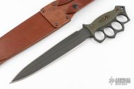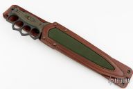 Embodying history and our own design philosophies, Lady Death is our rendition of the classic trench knife. We decided to go big, like no other, with a 15" overall length, and 9 5/8" CPM-Magnacut double-edge dagger blade with a long fuller down the middle. The knuckle duster style handle acts as a guard to protect your hands, and the aggressive outward shape works well for raking. To round out the overall shape, the end of the handle features a pronounced pomel for hammer-striking. The handle is finished with Dirty Olive G10 handle slabs with a checkered texture that is suitable in dry or wet conditions. The handle slabs are attached with Grade 5 Titanium fasteners that are electro-anodized in bronze to round out the look. Lady Death includes a brown leather sheath with a contrasting green canvas inlay. The sheath is ambidextrous, and can be worn on a belt or attached to PALS webbing.