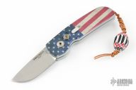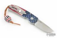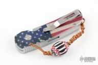 This Calmigo by Pro-Tech Knives features a California legal, satin finished drop point blade. The handle is comprised of an aluminum frame with a PK Custom anodized vintage American Flag, ramped sliding safety and mosaic push button. The steel deep carry pocket clip is positioned for right hand, tip up carry. Has a couple light scuffs, otherwise excellent condition. #167