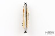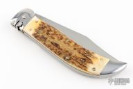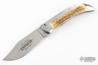 This Express Auto by Schatt and Morgan features a satin finished blade. The handle has stainless steel bolsters, torched stag scales, brass liners, stainless steel spring. Push the lever to fire and close the knife. This knife is a little hard to fire, and does not open all the way when deployed. Comes with original box. Has scuffs, scratches and patina, great condition otherwise.