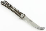 This limited edition Crossbones model has been upgraded with a slim titanium handle and a satin finished Bohler M390 steel blade. This special Crossbones series was made by LionSteel in Italy and limited to just 500 pieces worldwide. The CRKT Crossbones is a versatile everyday carry knife for daily cutting tasks, food prep, opening envelopes, and everything in-between. It features a full flat ground M390 blade that deploys swiftly on an IKBS ball bearing pivot system. The brushed titanium handle is built with a slender profile for easy, comfortable pocket carry using the deep-carry clip. This sleek knife is devoid of fluff and frill, with the dependability your EDC deserves. Comes with original box and papers. Has some light scratches, otherwise excellent condition.