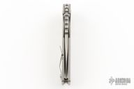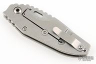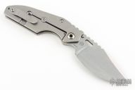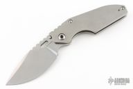 This XL Jibble by Mick Strider features a stonewashed blade with notched thumbrest and a thumbhole. The handle has a stonewashed titanium frame with tip up reversible clip. Nice detent, lockup and blade seating. Comes in a zipper case. Excellent condition.