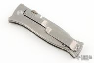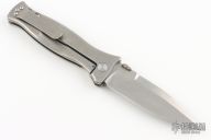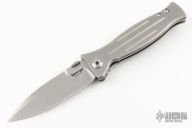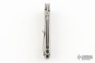 This MK3 by Les George features a satin finished blade with false top edge and knurled thumbdisc. The handle has a stonewashed titanium frame with 3 milled fullers and a titanium tip up clip. Nice detent, lockup and blade seating. Comes with a zippered case. Excellent condition.