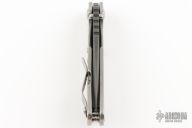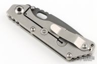 This Mick Strider SNG framelock folder features a black drop point blade with thumbhole and notched thumbrest. The handle has a stonewashed titanium frame with titanium deep carry clip, tip up carry. Jimping on blade spine. Includes Hinderer "Lock Bar Stabilizer" for maximum reverse lock retention. Excellent lockup, detent, and blade seating. Comes with a zipper case. Excellent condition.