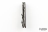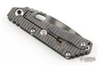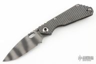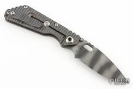 This Mick Strider Performance Series SNG CC framelock folder features a black drop point blade with thumbhole and notched thumbrest. The handle has a contoured and flamed titanium frame with titanium clip, tip up carry. Jimping on blade spine. Includes Hinderer "Lock Bar Stabilizer" for maximum reverse lock retention. Nice detent, lockup and blade seating. Comes with Bill's velcro case. Excellent condition.